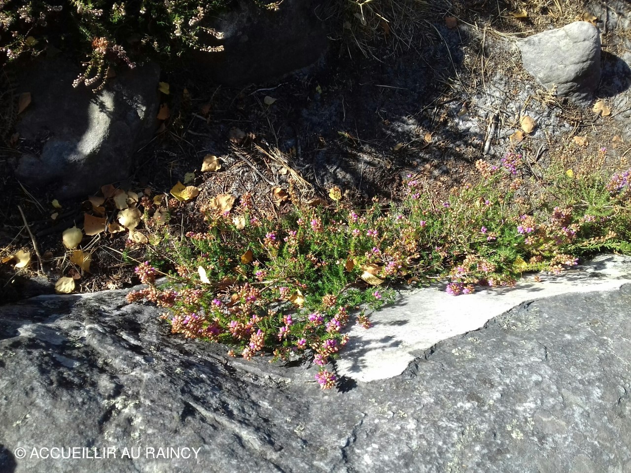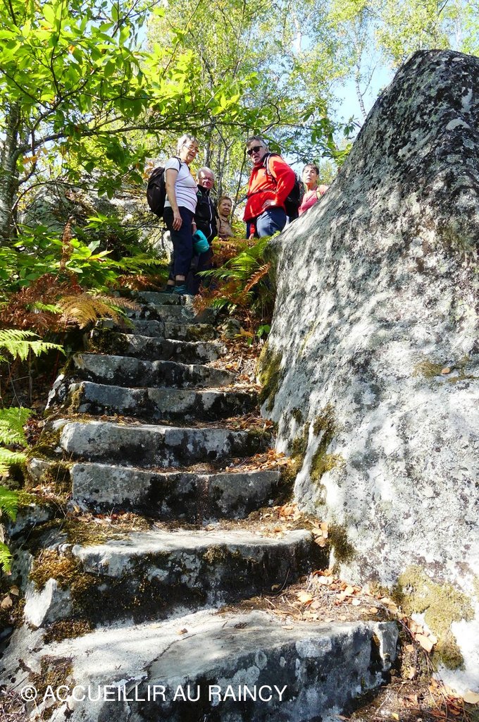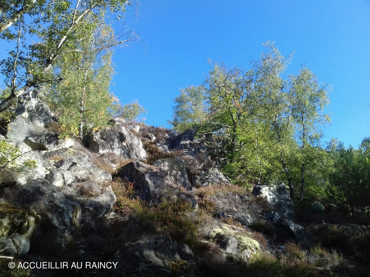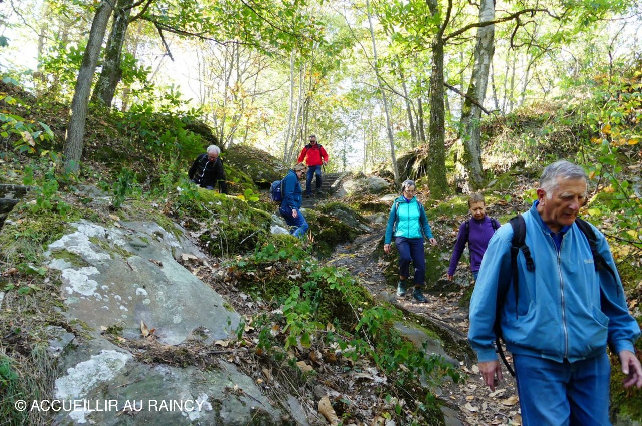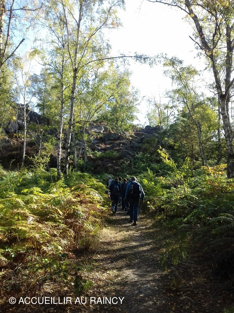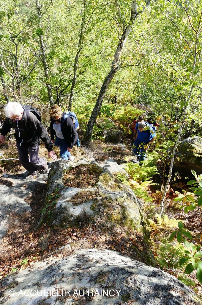 Huit randonneurs sous un beau ciel bleu et ensoleillé marchent et grimpent dans la forêt de Fontainebleau...